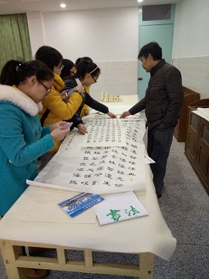 书法研习社汤舒静、周凤娇等八名成员成员一同前往十里坊小学向王道林老师学习书法。