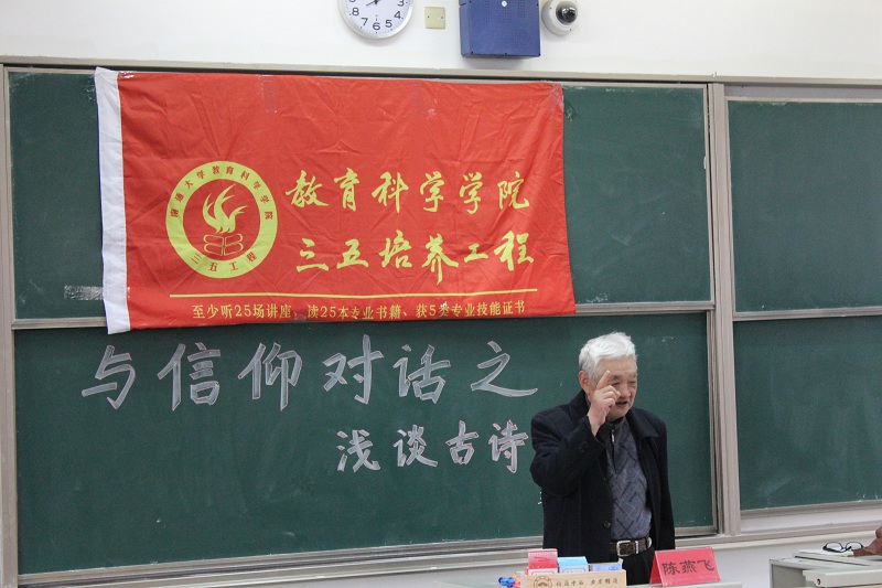 讲座伊始,陈老先生讲述了自己的职业生涯并积极与在场同学交流,了解在场同学对于古诗词学习情况。紧接着,他拿出了自己收藏的报纸,展现了自己“老来感慨”的诗作,从为人处事等四个方面写出了自己在耄耋之年的人生感悟。随后,老先生兴致很高地在黑板上陈列了诗词的卷轴与书法作品,让大家一起畅游诗词的海洋。最后,陈老师勉励在座的同学们用古诗词来陶冶情操,继承中华传统文化。