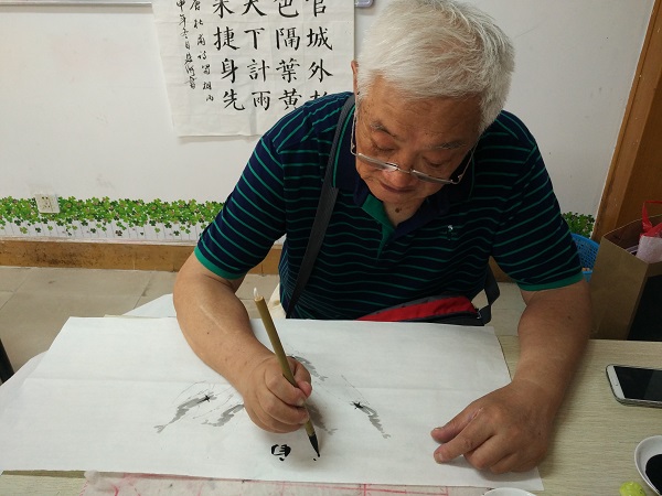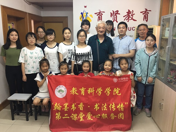 次日,全体成员来到指导老师陈燕飞爷爷家中,并在老人的带领下到学田社区育贤教育机构对小学生进行书法指导。