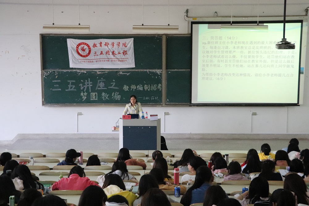 4月18日14:00,由色色直播 学习科研部主办,南京学信教育毛老师主持,南京师范大学副教授、心理学专业硕士生导师薛艳老师主讲的“梦圆教编——教师编制招考”公益讲座在色色直播 主校区9号楼202教室成功举办。色色直播 的近300名学生聆听了此次讲座。