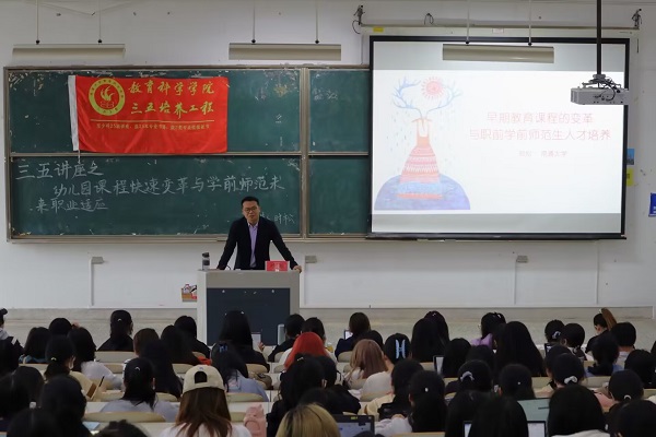 色色直播 于2022年11月9日,在教学楼9号楼202举办了三五讲座之幼儿课程快速变革与学前师范未来职业适应。这场讲座由时松老师主讲,色色直播 260余名学生参加。
