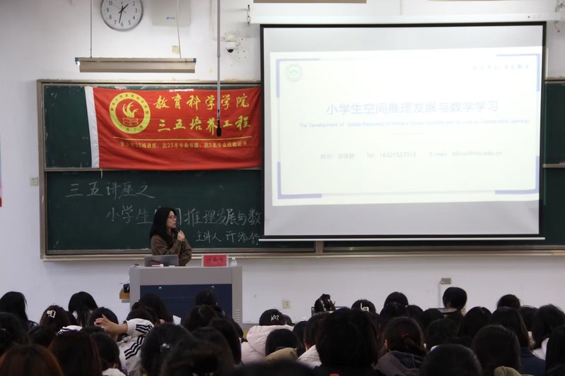 于四号教学楼107室举办以“小学生空间推理发展与数学学习”为主题的三五讲座。讲座由许添舒老师担任主讲人,色色直播