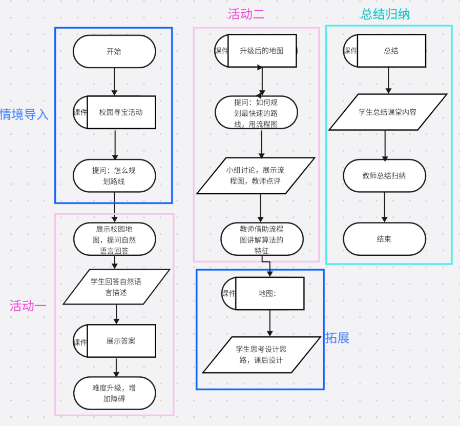 活动二:智破寻宝新难关 | 在原寻宝情境基础上,增加更多宝物和复杂条件。例如,某些宝物需特定工具或密码才能获取,且校园部分区域有“障碍”(如施工区域禁止通行)。要求学生重新设计寻宝算法,不仅要找到宝物,还要优化路线,减少不必要的步骤。同时,需用流程图形式表示算法。 教师:同学们刚刚规划的路线都非常好,但是现在又出现了一个问题,校园中的一些部分正在施工,无法通行,宝物也需要密码才能获取,大家来看看这个新地图,老师现在想要大家找到最快速的路线并且用流程图来表示。(教师在点评时分析算法的特征) | 小组讨论画出流程图并展示交流 | 在复杂条件下进一步深化算法设计,让学生体会到实际问题中算法的多样性和灵活性,同时引入流程图表示算法,使学生了解算法的另一种表达方式,培养学生的逻辑思维和抽象思维能力。 | 20min | |